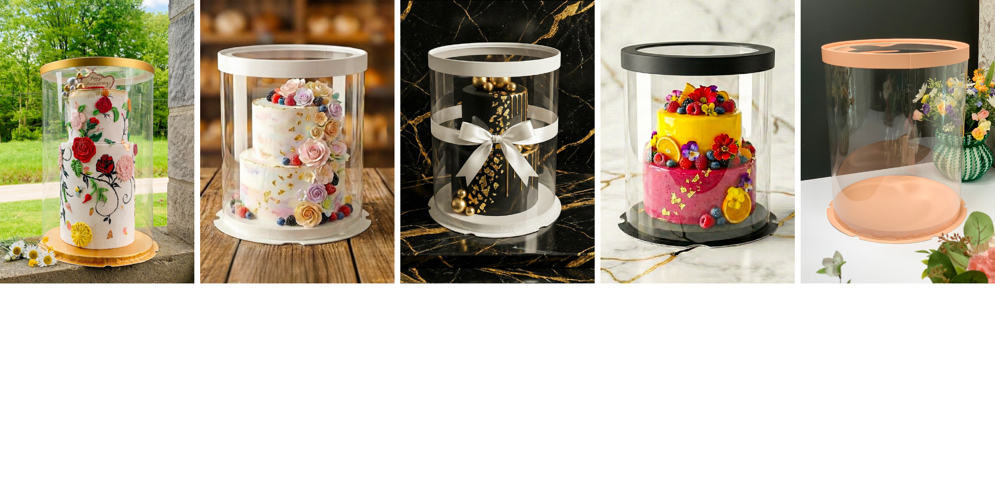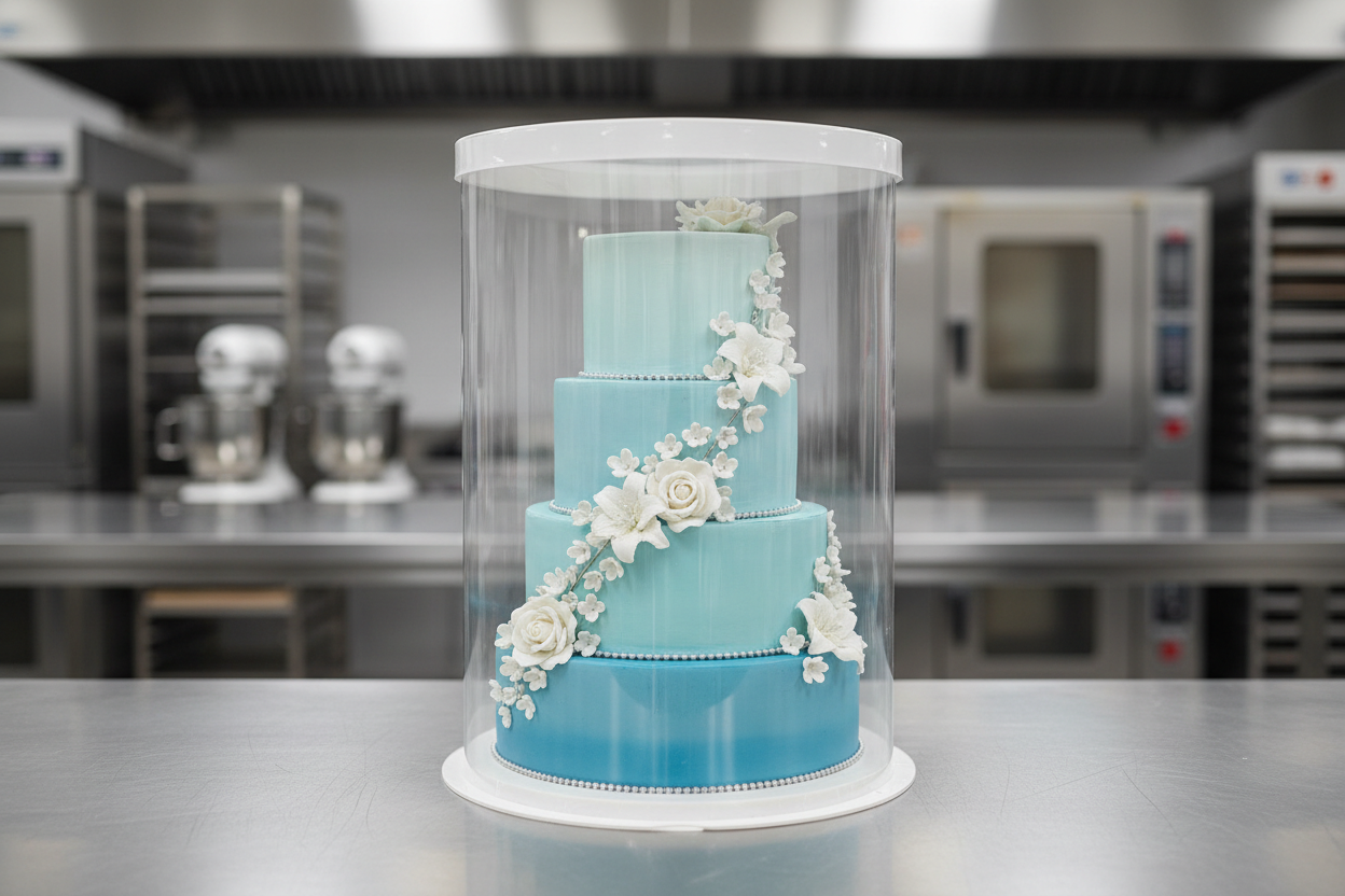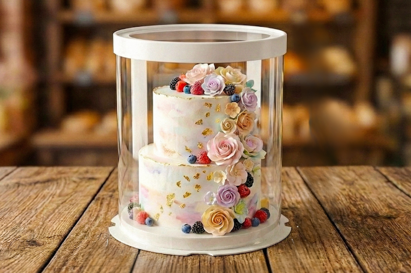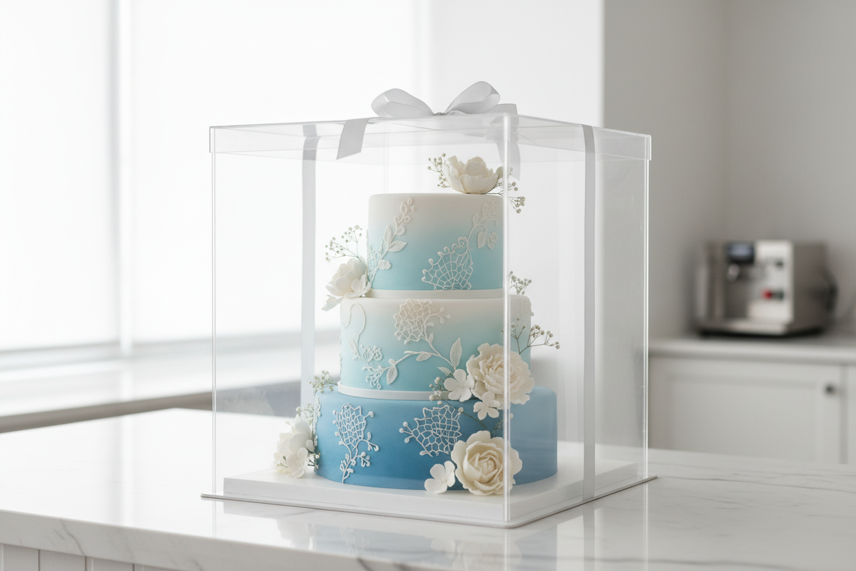 Crystal-clear display boxes engineered to protect tall, layered, and custom cakes in professional bakery environments.