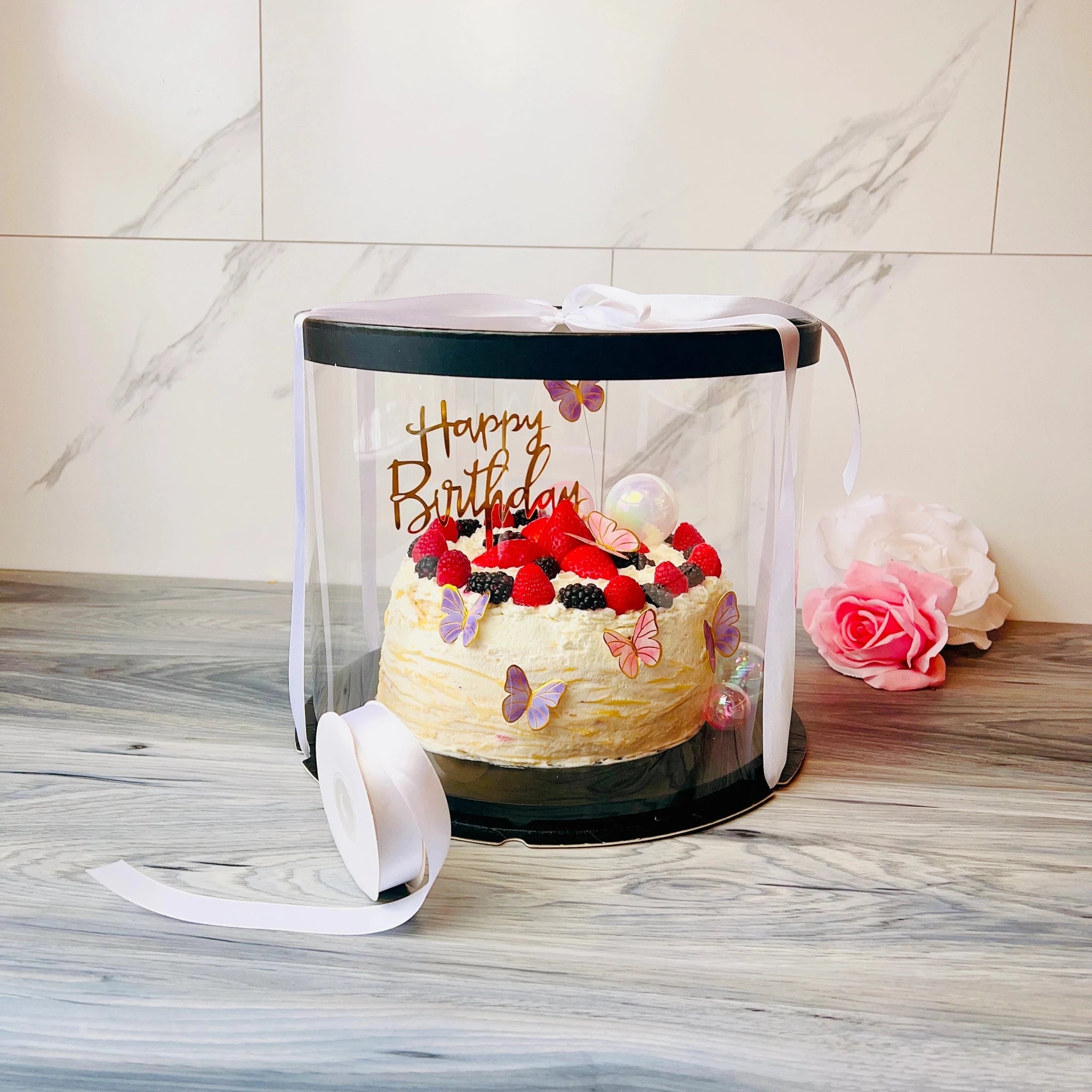 Each cake box includes a lid, clear plastic side and greaseproof base. It’s perfect for your 8", 9”, 10” cakes. With these clear cake boxes, you don’t have to put your beautiful creations into the plain cardboard cake boxes anymore. You can show off your beautiful cakes anytime and anywhere. You can use this transparent cake box as gift box for flowers, stuffed toys, chocolates, strawberry towels, macaron towels, doughnuts towels or any other special gifts.