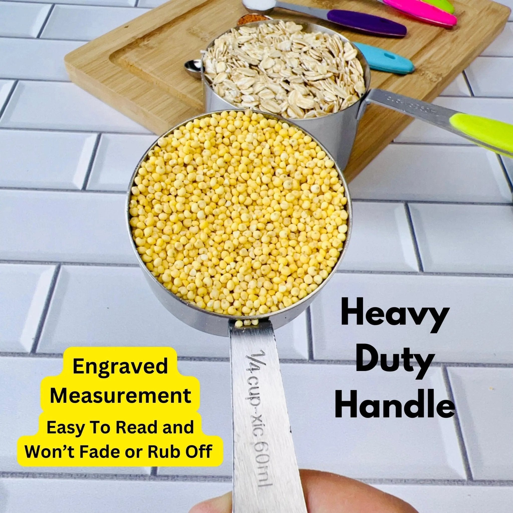 These measuring cups and spoons are made of durable stainless steel, ensuring long-lasting use for all your cooking and baking needs. The sturdy construction makes measuring both dry and liquid ingredients a breeze, providing accurate results every time.