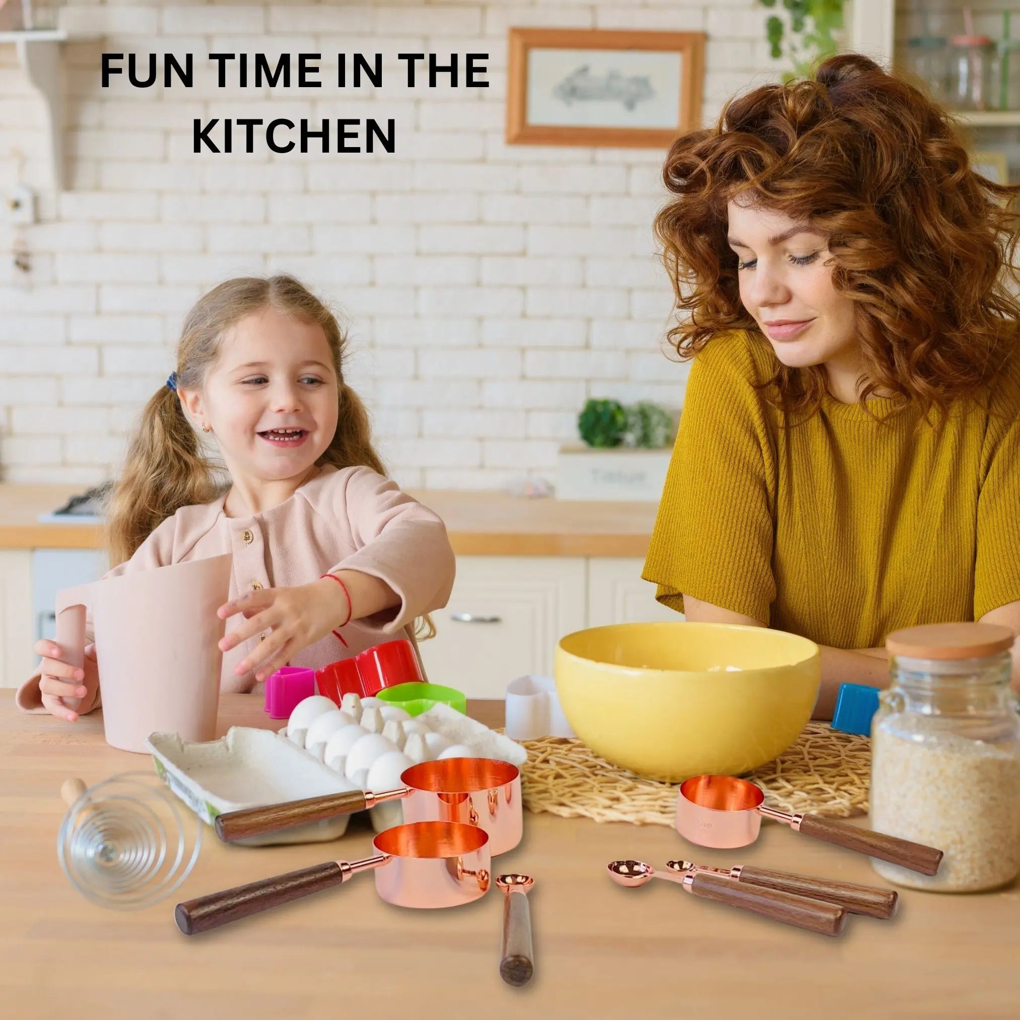 🏆BEAUTIFUL COLOR – The pairing of the rose gold-colored stainless steel with the wooden handle is a beautiful combination that provides class to your kitchen. The measurements on cups and spoons are very well carved and easy to read.