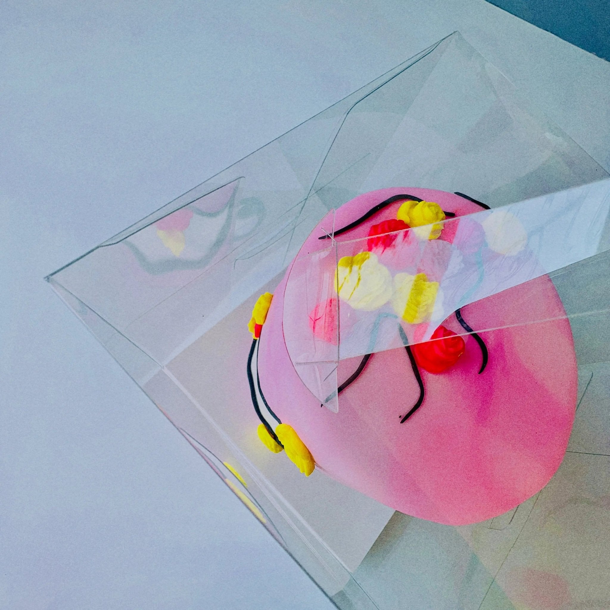 The side of the box is one piece of plastic, peel off the protective film to get the clear effect. And one film on the handle also. The base is easy to fold up and slide into the clear box. You don’t have to use the base if you need more height for your dessert, you can just use the white cake board.