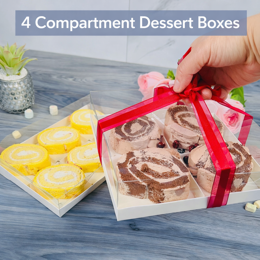 Clear dessert boxes with separators designed for professional bakeries, micro-bakers, and cake artists. Available with 4 or 6 holes, these sturdy boxes feature clear covers and separators - versatile for donuts, cake bombs, cookies, and mixed desserts.