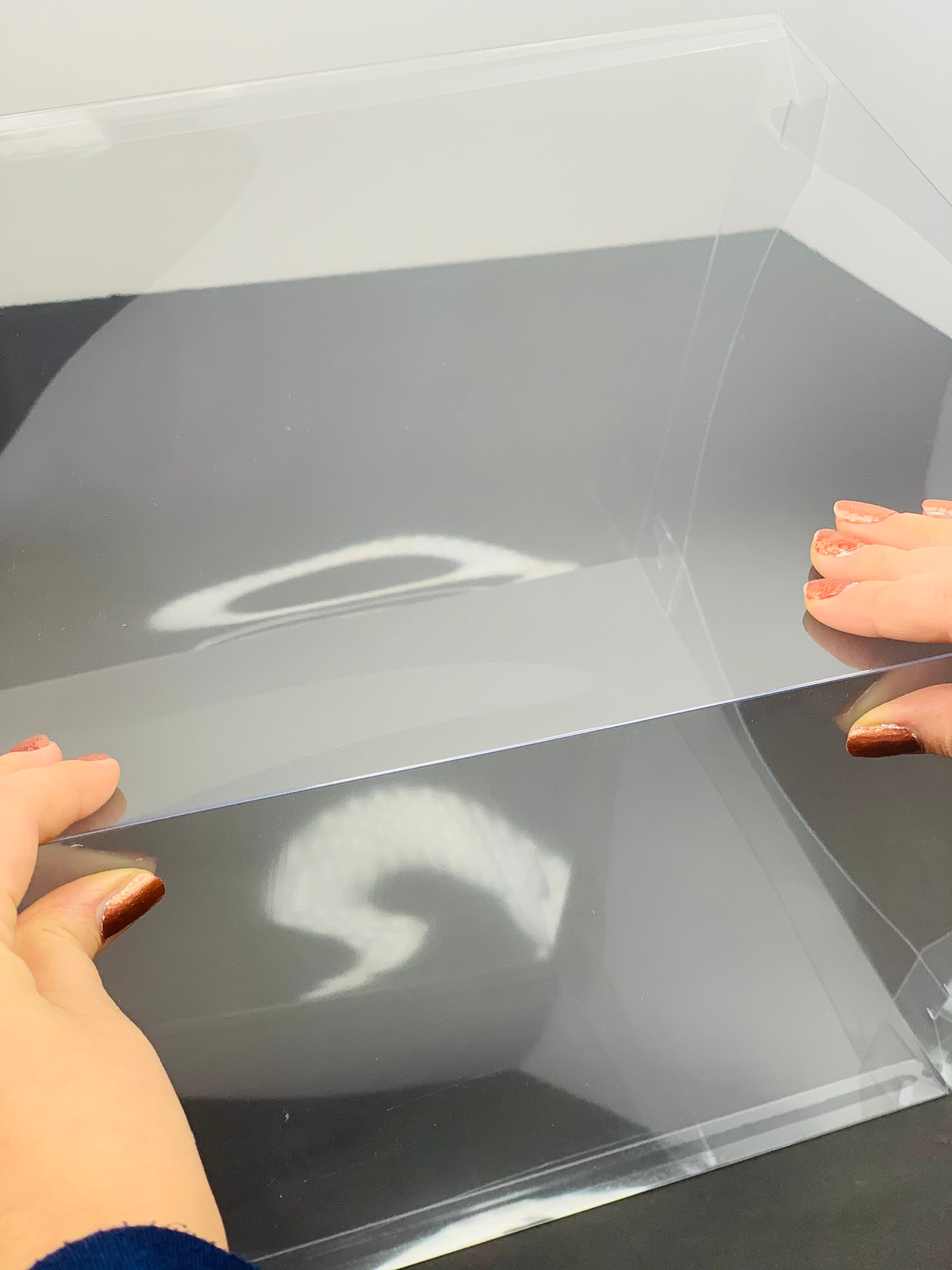 Each cake box has the whole clear lid and side, that makes the cake box clean yet elegant. The clear lid and side of the cake box has a layer of protective film, peal it off before assembling.